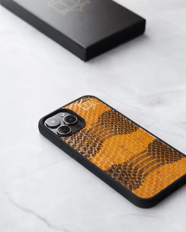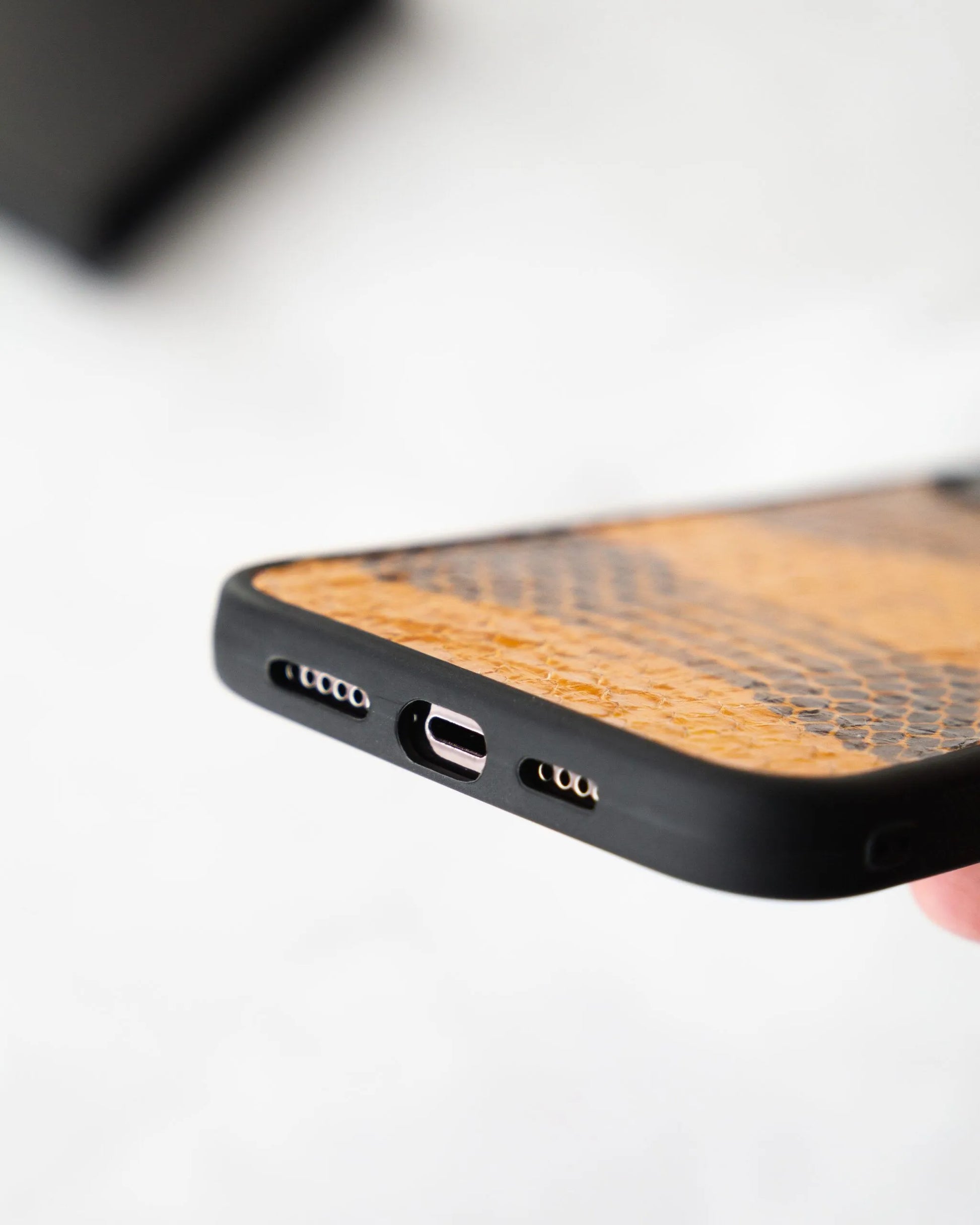 Cover in vera pelle di pitone dipinta a mano, per un pezzo unico ed esclusivo. Scheletro in plastica TPU morbida ultraresistente, foderato in vellour, pensato per proteggere con stile e garantire il massimo comfort.