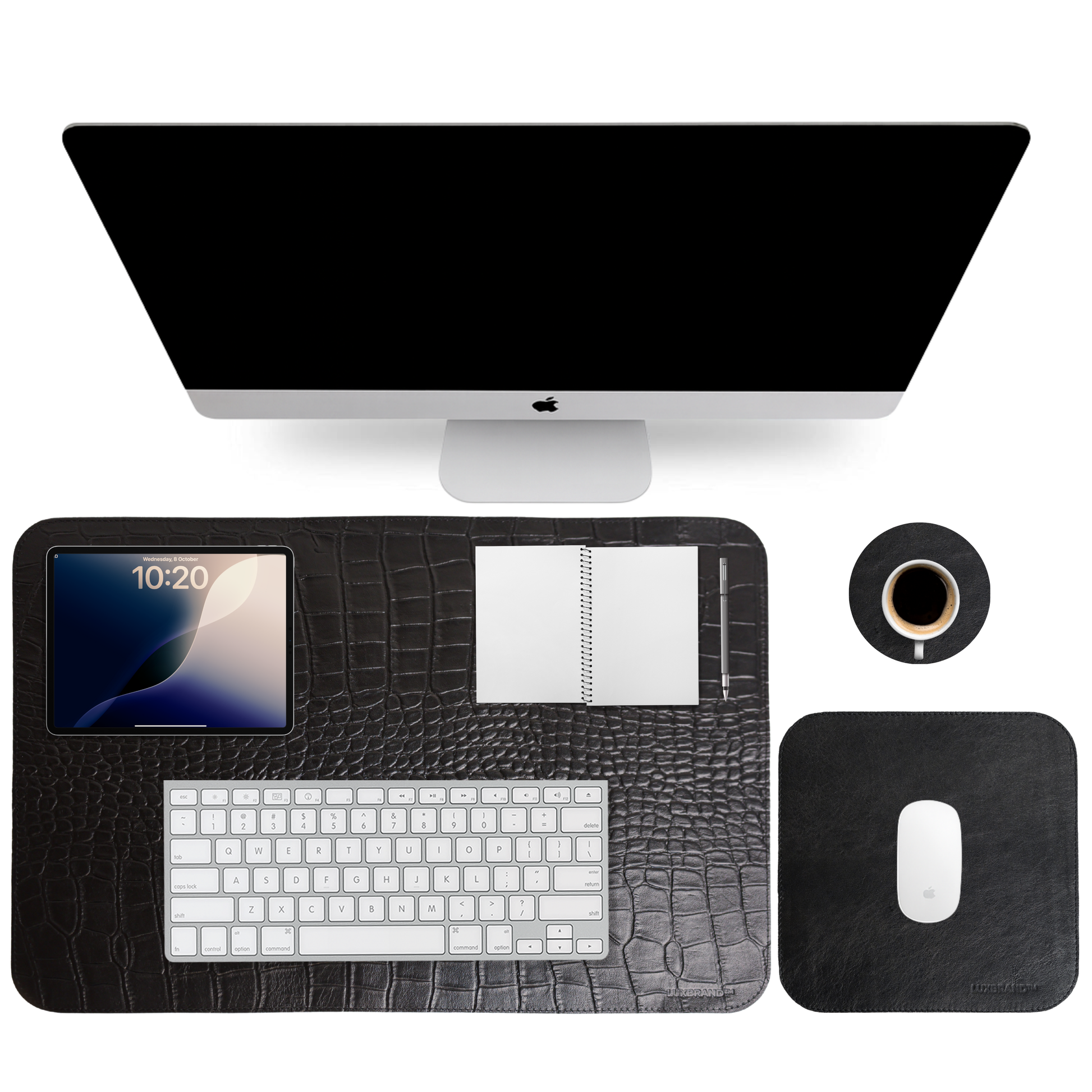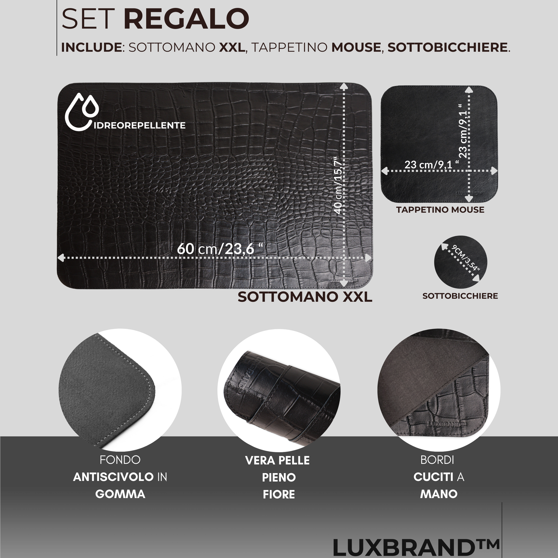 SET COMPLETO E FUNZIONALE – Il set include XXL desk mat 60 × 40 cm, mouse pad 23 × 23 cm e sottobicchiere abbinato in vera pelle da Ø 9 cm. Una soluzione completa per organizzare la scrivania, proteggere le superfici e aggiungere un dettaglio di stile coordinato.