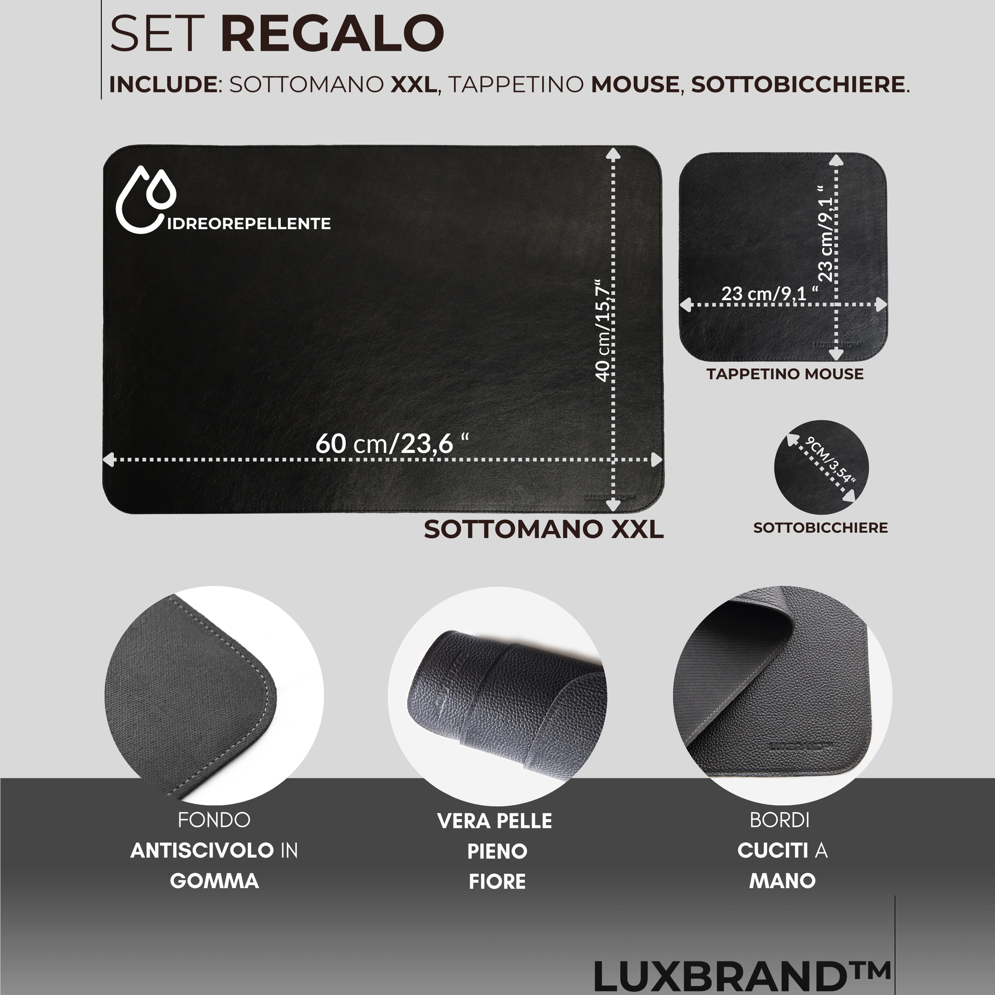 SET COMPLETO E FUNZIONALE – Il set include XXL desk mat 60 × 40 cm, mouse pad 23 × 23 cm e sottobicchiere abbinato in vera pelle da Ø 9 cm. Una soluzione completa per organizzare la scrivania, proteggere le superfici e aggiungere un dettaglio di stile coordinato.